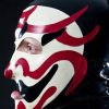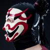 Intricately appliqued hood in the style of a Japanese samurai or Kabuki actor.